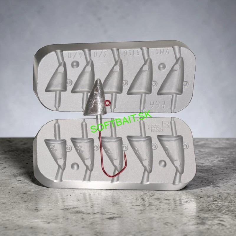 Forma na jigové hlavy F-66 s gramážami 20g, 25g, 30g, 35g, 40g. Odporúčame jigový háčik VMC 5150 3/0 alebo 4/0.
