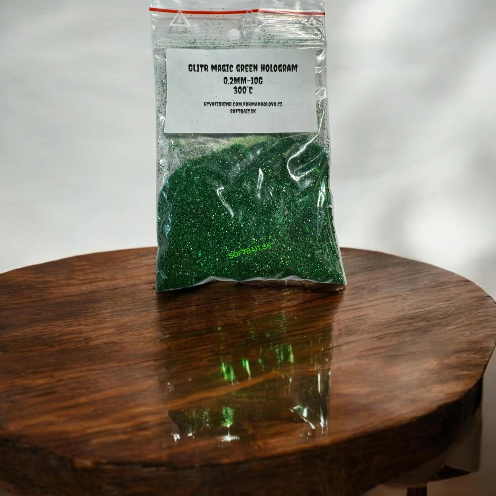 Predstavujeme vám Ryvalures Glitter Magic Green Hologram 0,2 mm s obsahom 10g. Tento odolný glitter je schopný zniesť vysoké teploty a je tepelne odolný až do 220 °C. Ideálne do horúcej gumy na výrobu vašich gumových nástrah. Vytvorte nádherné a žiarivé nástrahy s týmto kúzelným zeleným holografickým glitterom od Ryvalures.