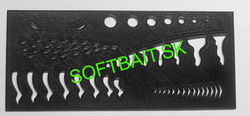 Šablóna pre nástrek reliéfu na gumové nástrahy, vyrobené s polyetyléne terephthalate glycolu. Šablóna je na opakované použitie.